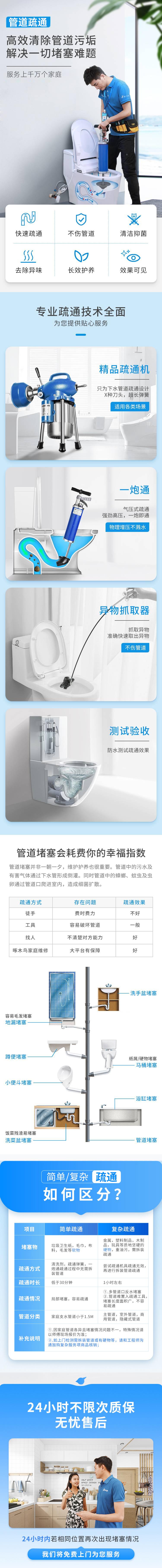疏通马桶/地漏/洗菜池/洗手盆/浴缸/蹲便等各种家庭管道,包含大型管道疏通。 注意事项: 1、因家庭管道各异且堵塞情况问题不一,特殊情况请以师傅现场报价为准; 2、此商品为简单疏通,如上门检测需拆装管道或有硬物等,请和工程师沟通加购复杂服务项商品。 简单疏通:由垃圾卫生纸,毛巾,布料,毛发等软物引起的堵塞 复杂疏通:由金属,塑料制品,木制品,玩具等质地坚硬的硬物或重油污引起的堵塞,以及需要进行拆装的疏通, 服务保障: 1、同性质且同部位故障保修24小时; 2、更换配件材料保修30天; 3、免责条款:自备材料、动物破坏、人为因素、私自拆机、外观件以及其他不可抗因素等不在保修范围。